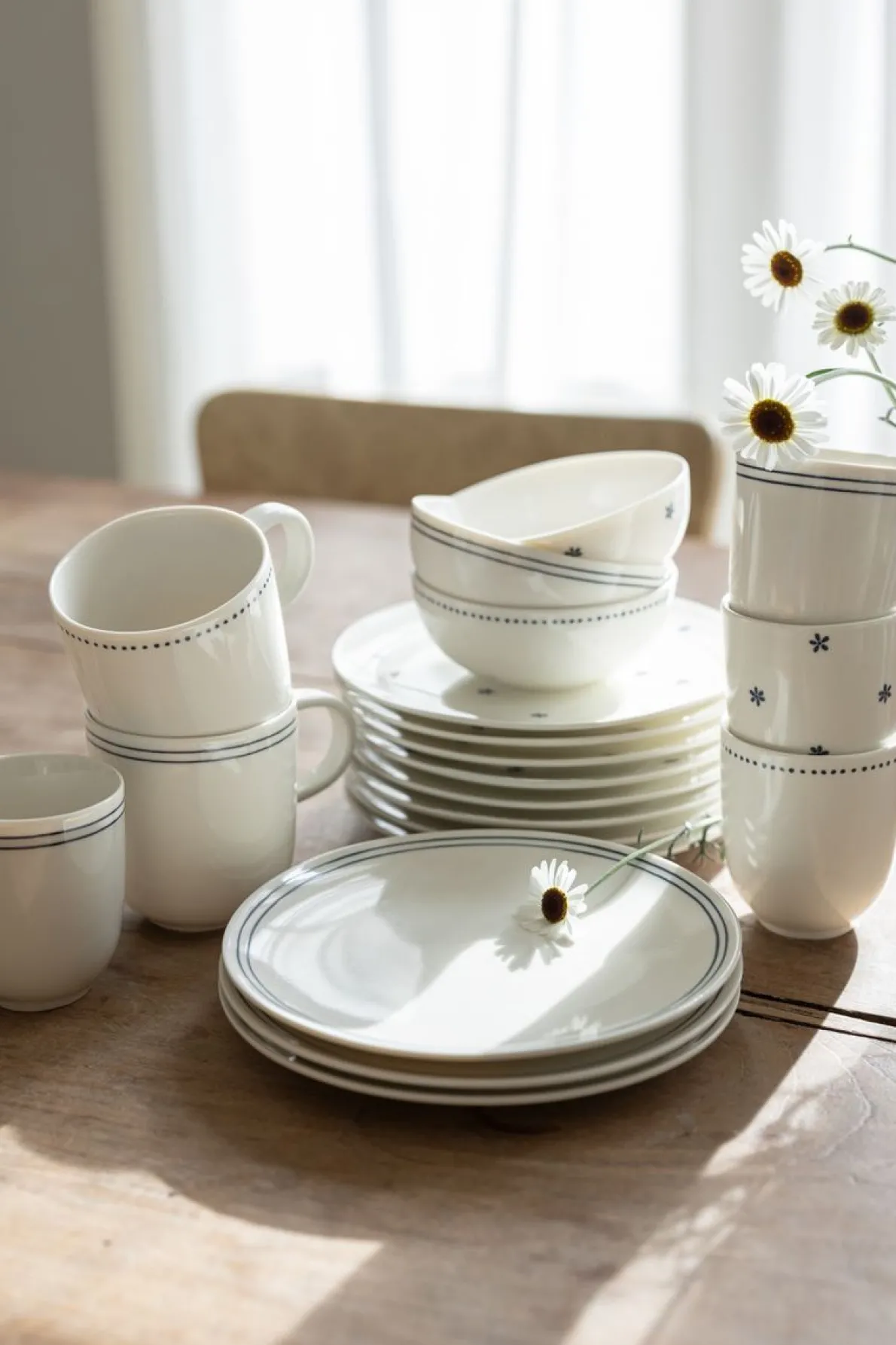 Leuk bord voor je ontbijt, maar ook perfect voor een voor- of nagerecht. Dit bord is onderdeel van een serviesserie bestaande uit een beker, theemok, kommetje en dit ontbijtbord. Een mooi organisch servies van porselein en verkrijgbaar in drie verschillende dessins. De donkerblauwe bloemetjes zijn een decal. Dit is een speciale folie dat op hoge temperatuur in de oven op het servies wordt gebrand. Het servies kan daardoor in de vaatwasser. De verschillende printjes – ontworpen door Dille & Kamille – passen leuk bij elkaar, maar zijn ook een mooie aanvulling op ons organisch gevormde witte servies.