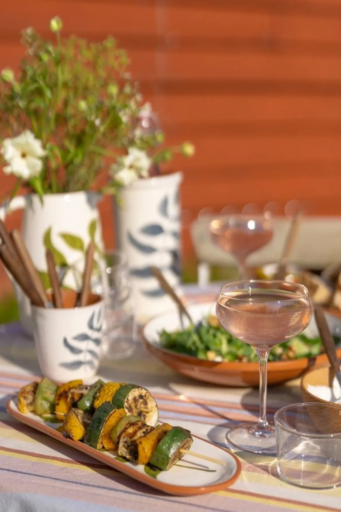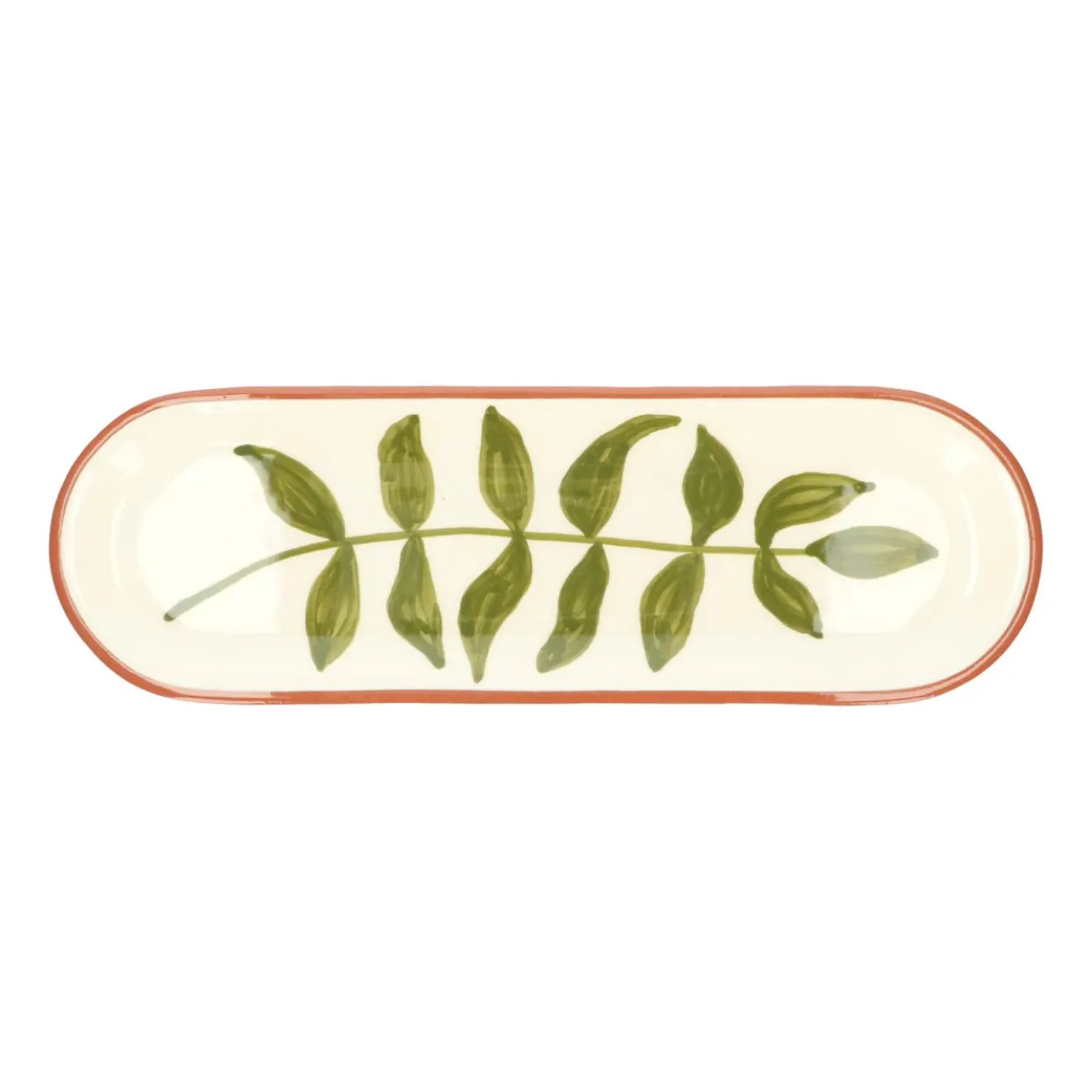 Mooie en praktische schaal om te gebruiken om gerechten, zoals bijvoorbeeld asperges of koekjes, snacks en andere lekkere dingen op te serveren bij de koffie of de borrel. De schaal is onderdeel van een serviesserie. Een zomers servies van geglazuurd terracotta, gemaakt in Portugal. Met dit servies creëer je een warme Mediterrane sfeer op tafel. De schaal heeft een geglazuurde crèmekleurige binnenkant en een terracotta buitenkant. Het blad is met de hand geschilderd. Erg mooi in combinatie met de andere onderdelen van dit servies en leuk om te gebruiken met bijv. onze kommetjes en serveerplanken van acaciahout. Het dessin is een eigen ontwerp van Dille & Kamille.