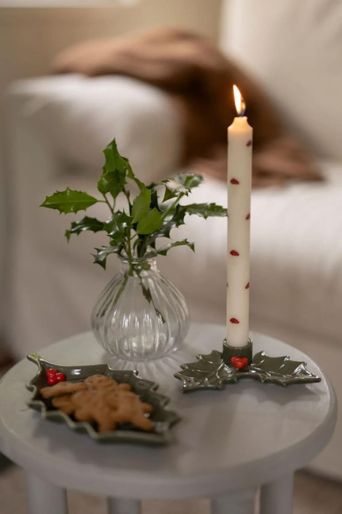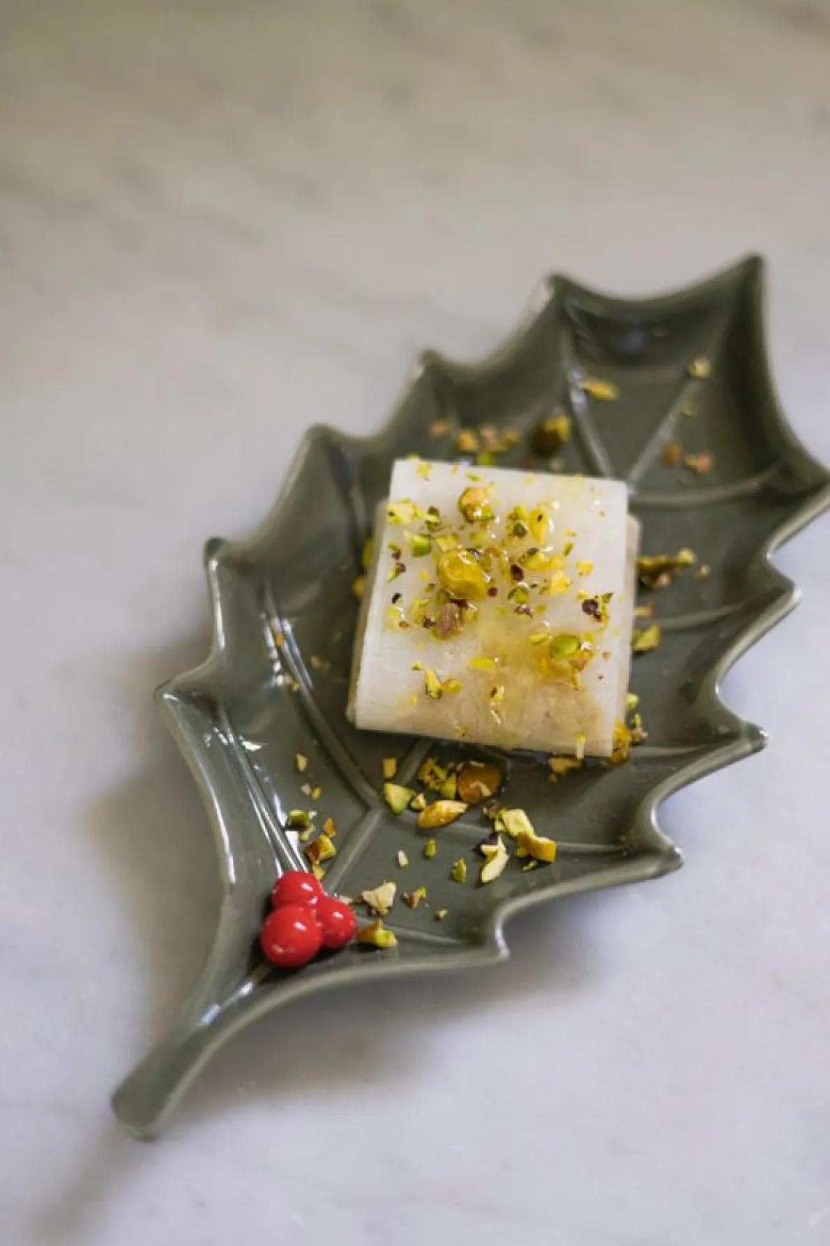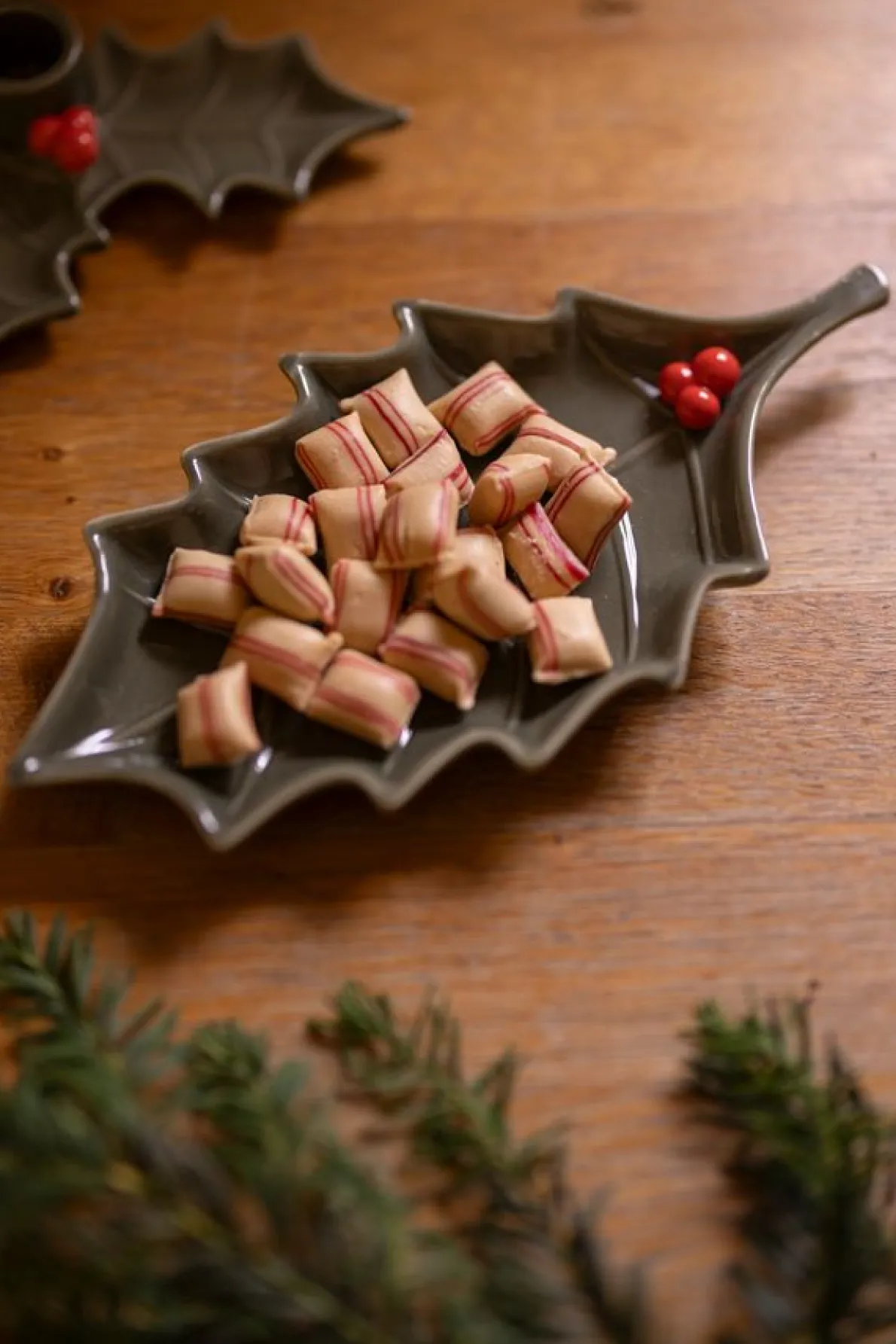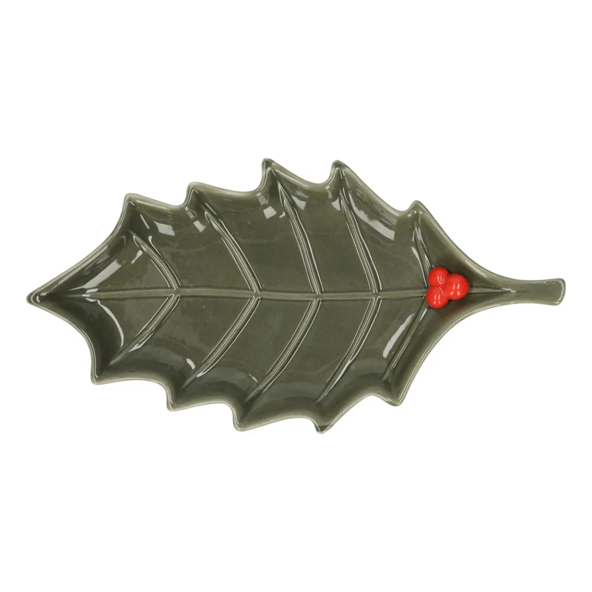 Mooi schaaltje van geglazuurd porselein in de vorm van een hulstblad. Leuk om bijvoorbeeld kerstkoekjes, chocolaatjes of zoutjes op te serveren.