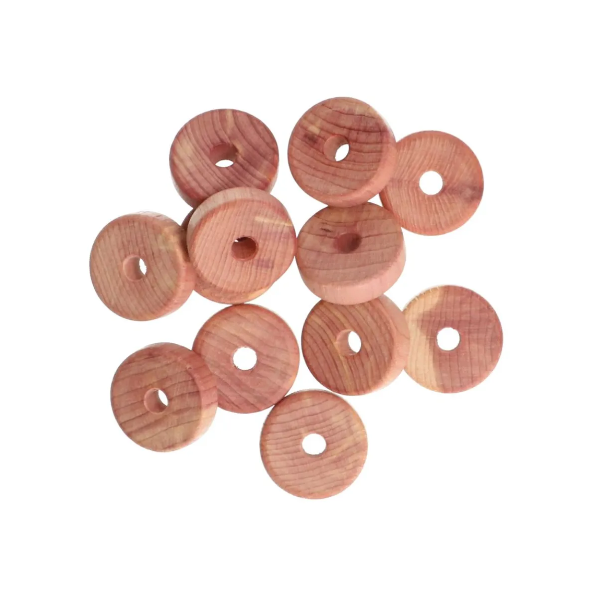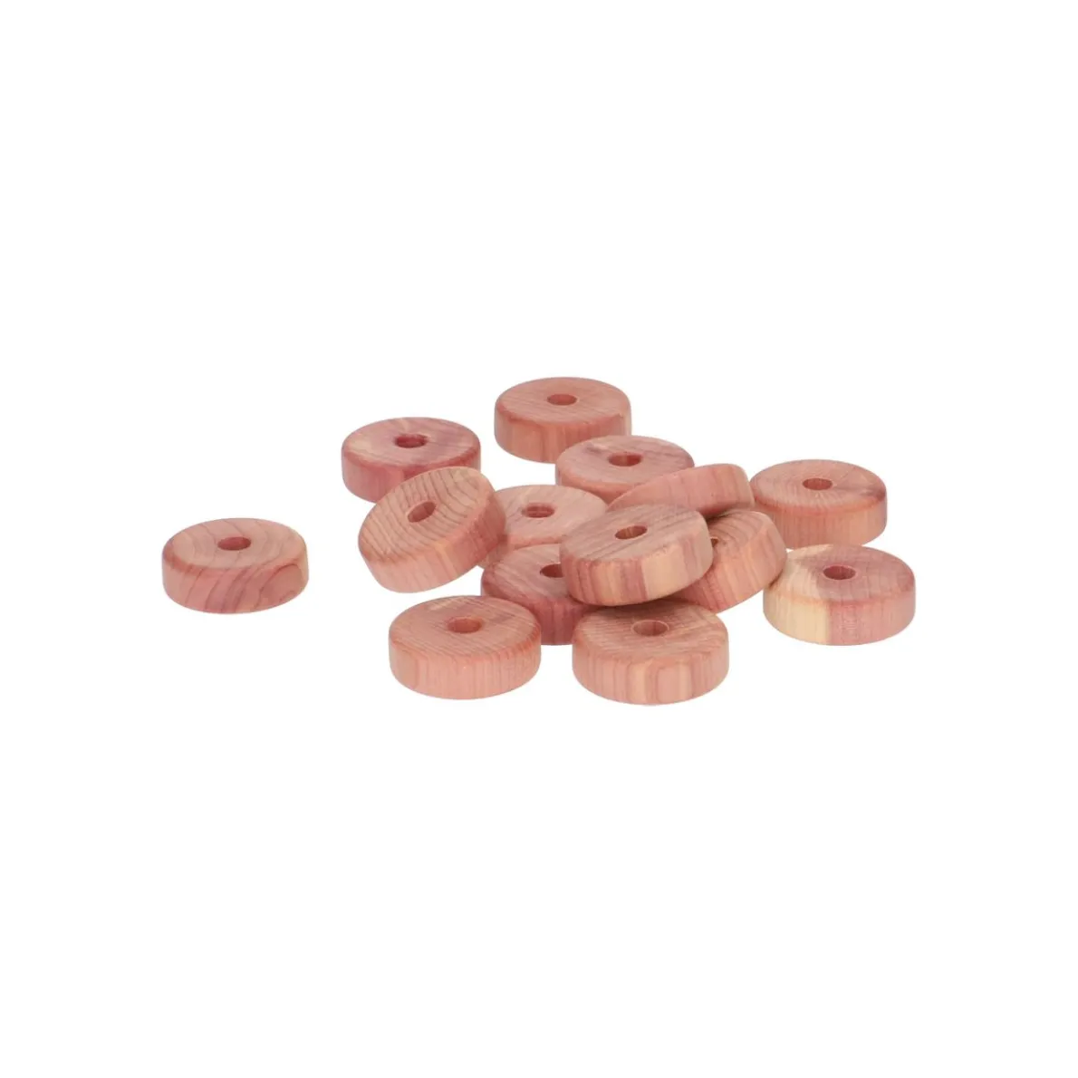 Het hout van Rode ceder ruikt niet alleen heerlijk, het neemt ook vocht op en houdt je kast fris. Ideaal als je in de zomermaanden je winterkleding opbergt. Leg deze cederhouten schijfjes tussen je wollen truien en linnengoed in de kast. Maar ook onder kussens en matrassen, in opbergdozen en koffers om alles goed droog en fris te houden.
