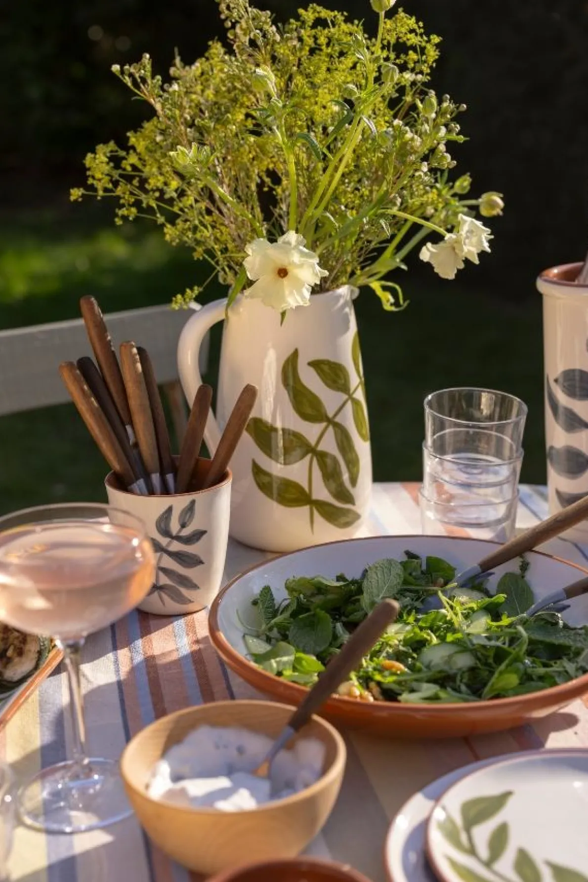 Mooie en praktische schaal, voor fruit, pasta of salades en om gerechten in te serveren. Deze serveerschaal is onderdeel van een serviesserie. Een zomers servies van geglazuurd terracotta, gemaakt en handgeschilderd in Portugal. Met dit servies creëer je een warme Mediterrane sfeer op tafel. De schaal heeft een geglazuurde crèmekleurige binnenkant en een terracotta buitenkant. Erg mooi in combinatie met de andere onderdelen van dit servies en leuk om te gebruiken met bijv. onze kommetjes en serveerplanken van hout. Het dessin is een eigen ontwerp van Dille & Kamille.