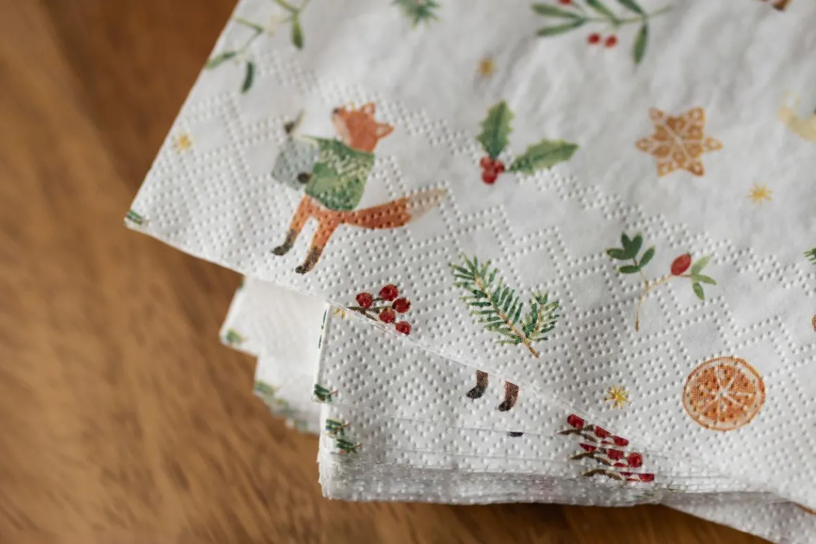 Mooi en sfeervol op je kersttafel: papieren kerstservetten, bedrukt met verschillende kerstdieren, takjes en andere kerstfiguurtjes. Tip: de servetten zijn ook leuk om kleine cadeautjes in te verpakken.