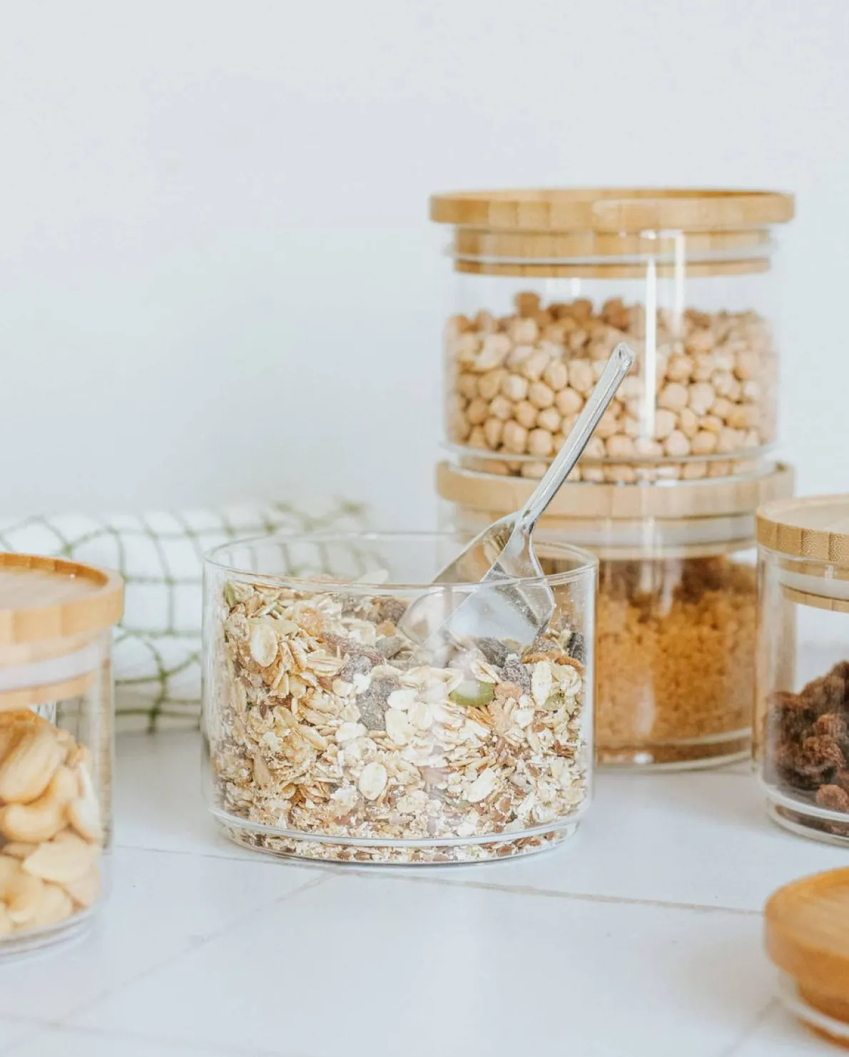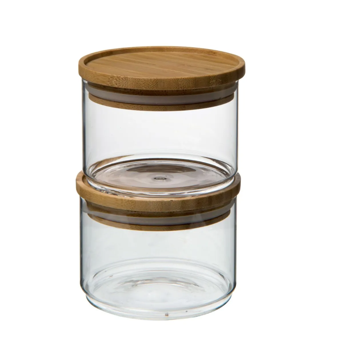 Ronde pot voor het bewaren van snoep, dropjes, thee, etc… Het bamboe deksel sluit luchtdicht af dankzij de doorzichtige kunststof afsluitring, zo houdt je de inhoud droog en vers. Door het profiel op het deksel kan het potje goed gestapeld worden.
