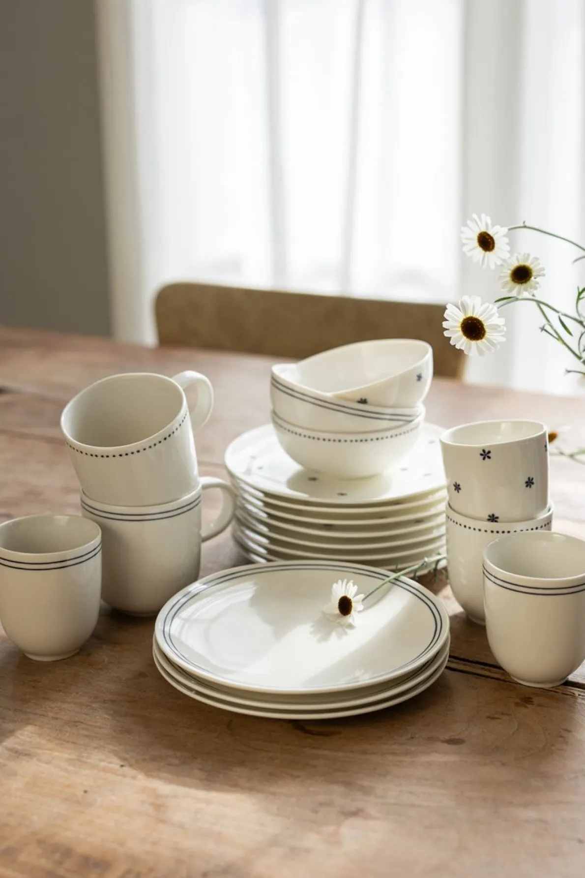 Met deze mooie theemok, bedrukt met blauwe stipjes, geniet je nog meer van je kop thee. De mok is onderdeel van een serviesserie bestaande uit een beker, ontbijtbordje, kommetje en deze theemok. Een mooi organisch servies van porselein en verkrijgbaar in drie verschillende dessins. De donkerblauwe stipjes zijn een decal. Dit is een speciale folie dat op hoge temperatuur in de oven op het servies wordt gebrand. Het servies kan daardoor in de vaatwasser. De verschillende printjes – ontworpen door Dille & Kamille – passen leuk bij elkaar, maar zijn ook een mooie aanvulling op ons organisch gevormde witte servies.