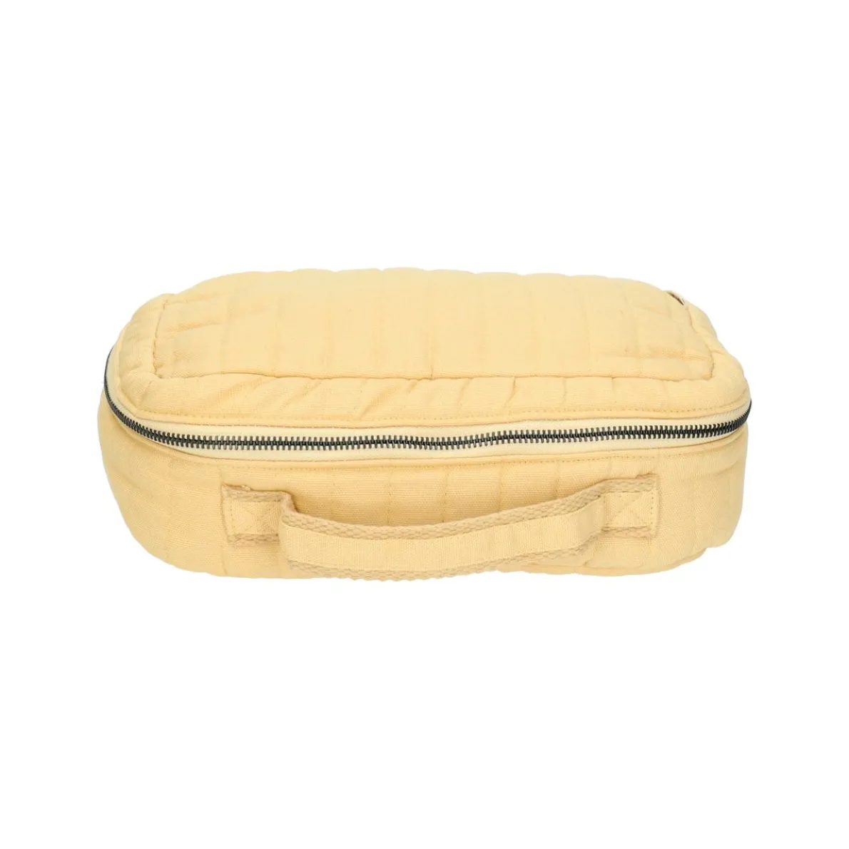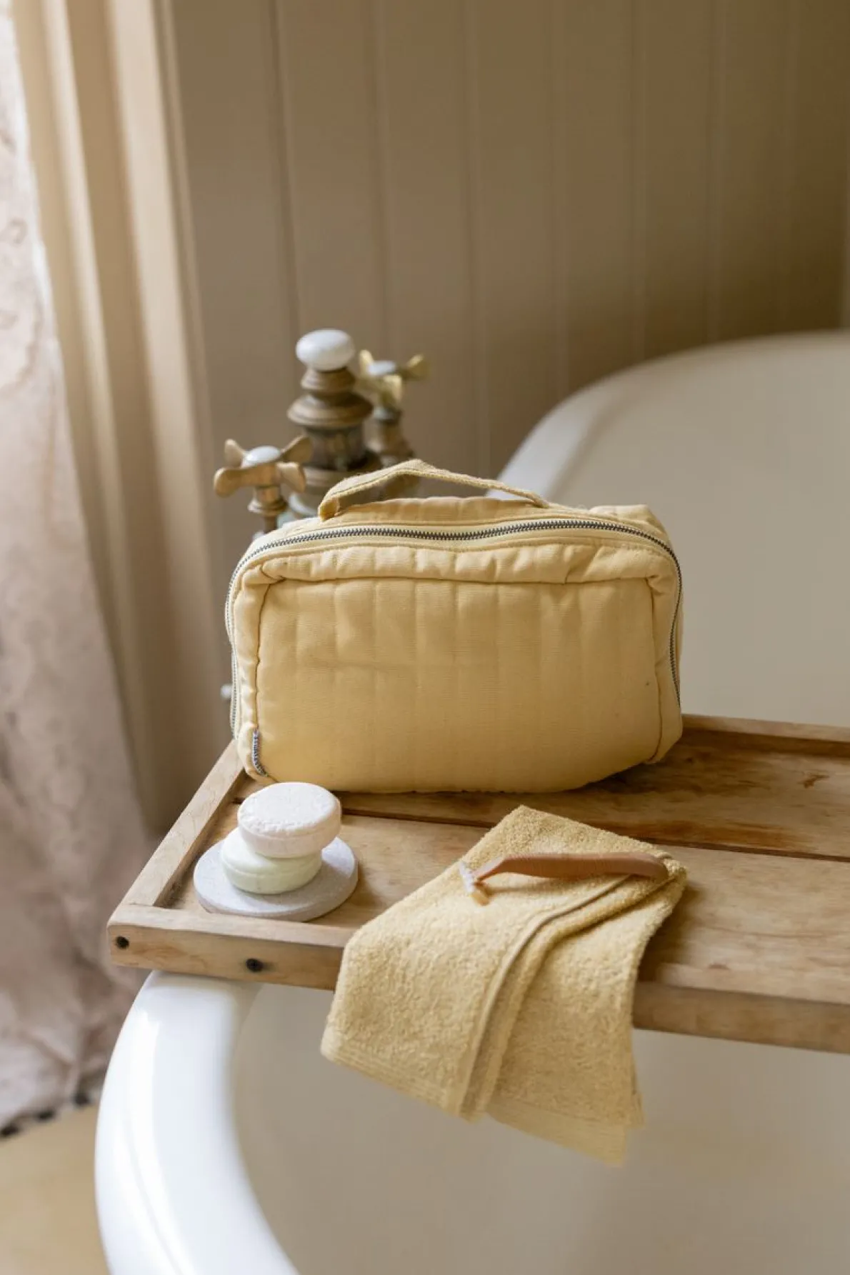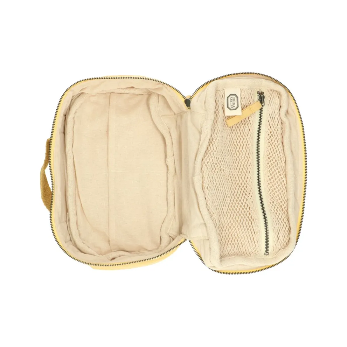 In deze gele toilettas met ritssluiting kun je al je favoriete toiletspullen kwijt. Dankzij het handige en ruime formaat is hij makkelijk mee te nemen in je tas of koffer. Ideaal om mee op reis te nemen. De toilettas is gemaakt van zacht biologisch katoen met stiksels. Leuk om te combineren met het kleine toilettasje om je make-up en andere kleine spullen in mee te nemen.
