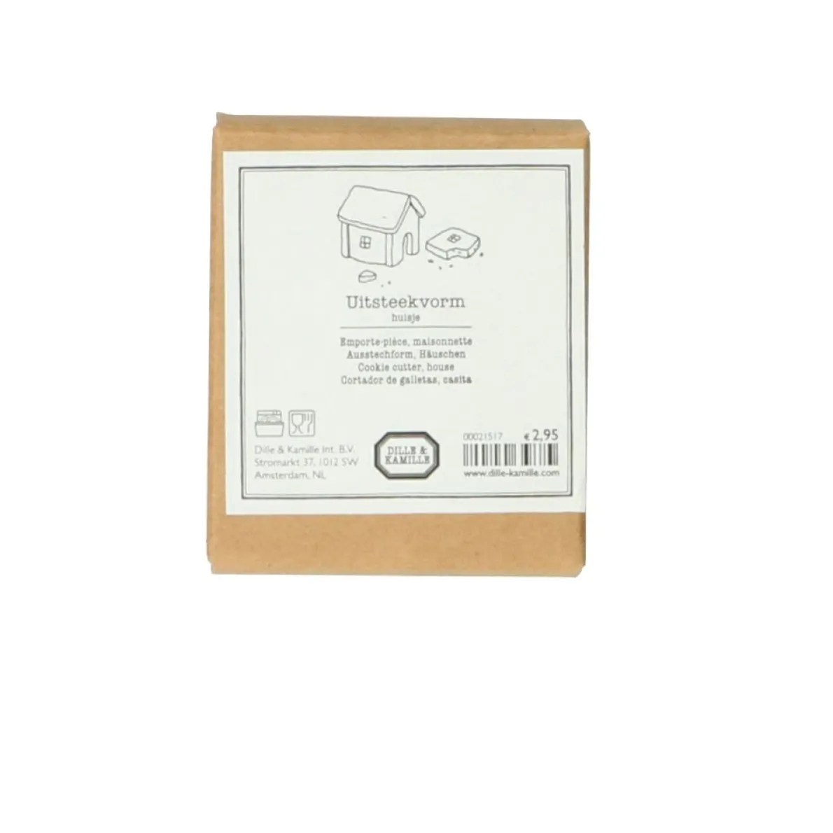 Drie uitsteekvormpjes voor het bakken van koekjes in de vorm van een huisje. Na het bakken zijn de koekjes aan elkaar te ‘plakken’ met bv. glazuur. Hierdoor ontstaat een huisje, met inkeping om bv. over de rand van een kopje te hangen.