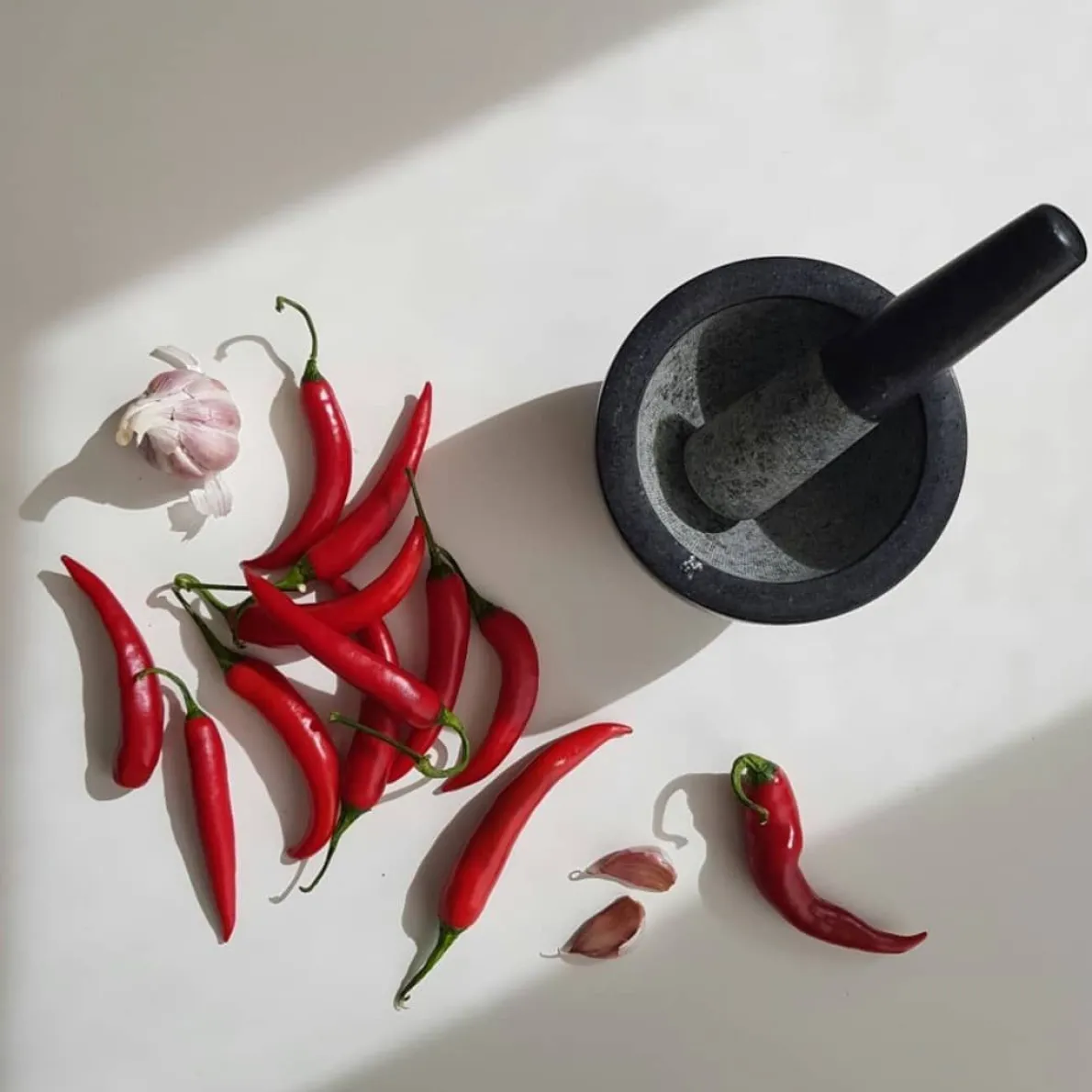 Vijzel en stamper van zwart graniet. De stamper en binnenzijde van de vijzel zijn enigszins ruw, om moeiteloos kruiden, specerijen, knoflook etc. fijn te stampen of te wrijven. De kom van de vijzel is ruim genoeg om ook bv. pesto, mayonaise, Aziatische currypasta’s en boemboe’s te maken. Hoogte 9 cm, Ø 13 cm. Gewicht 2,4 kg. Bekijk hier de gebruiksaanwijzing met onderhoudstips voor de vijzel.