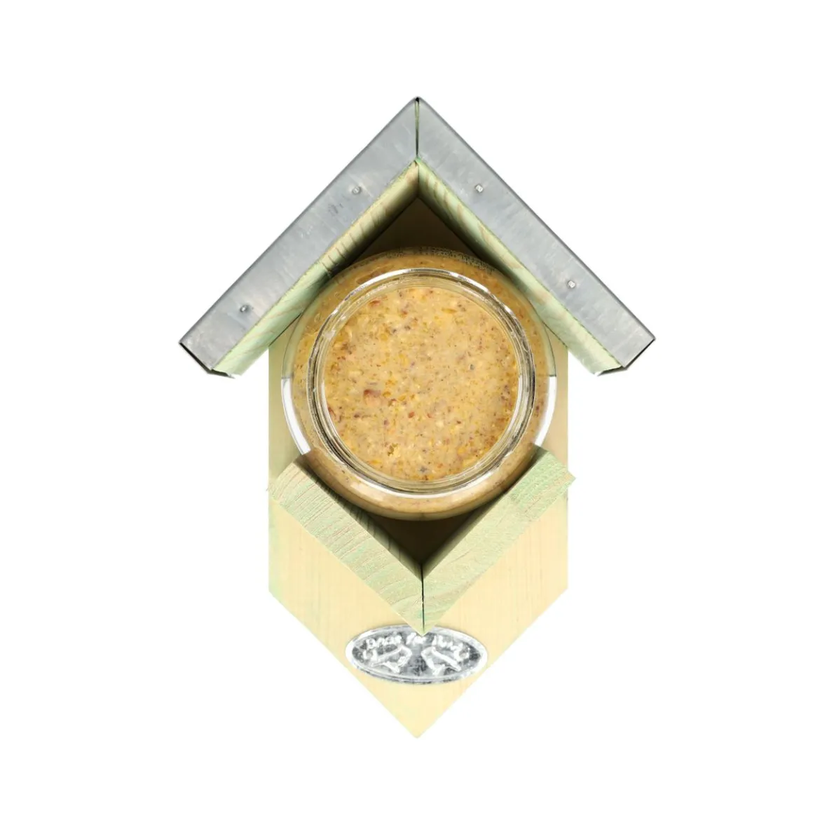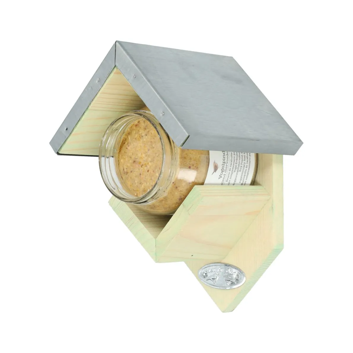 Stevig voederhuis van FSC vurenhout met zinken dak en ophanggaatje. Onder het dak kun je precies een pot pindakaas (kleine maat) klemmen. Mezen, maar ook spreeuwen en spechten, zijn hier dol op. Kijk voor andere vogelvoedertips op onze website. Afmetingen voederhuisje: 13 x 14,5 x 19,5 cm. Voor een (pindakaas)pot van Ø 8,5 cm, maximale lengte ca. 11 cm.