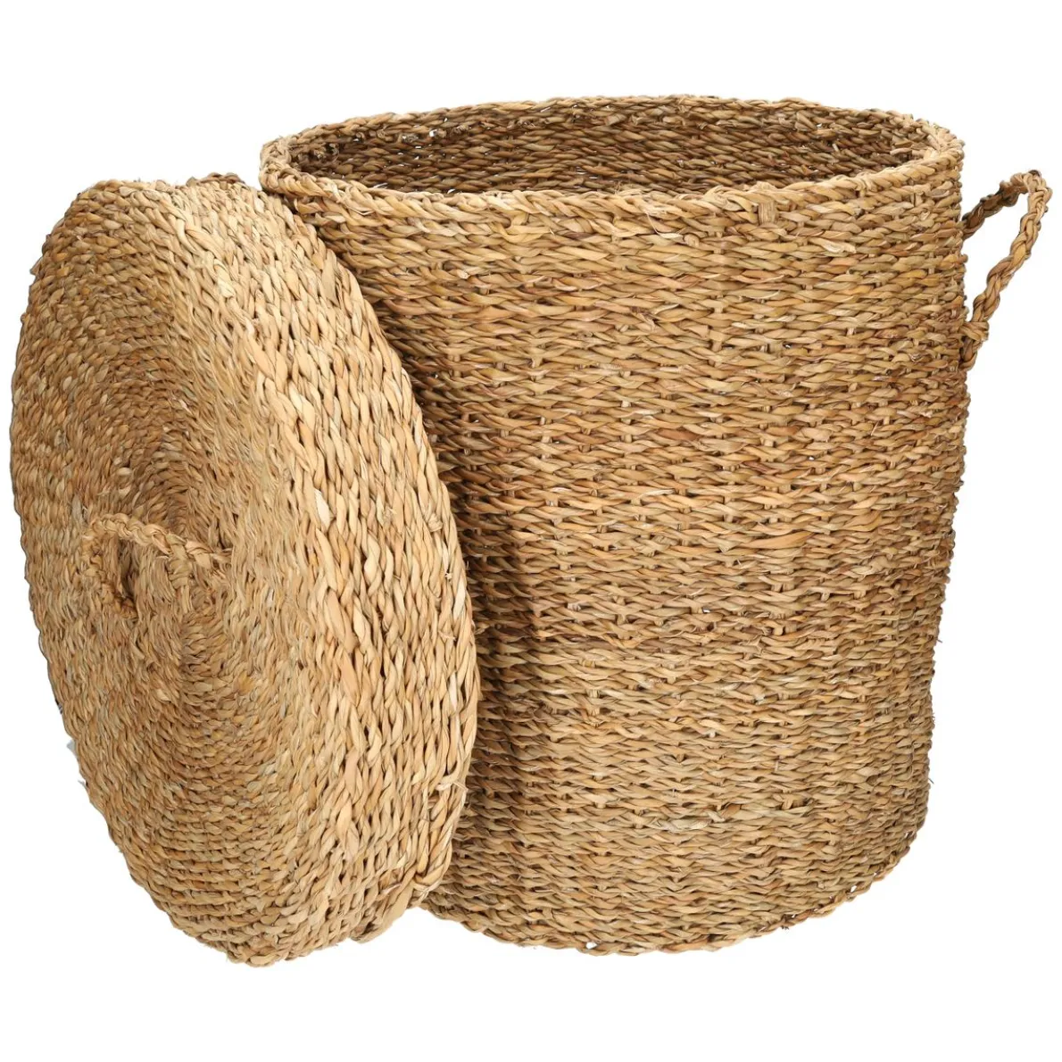 Stijlvolle, hand gevlochten ronde wasmand van zeegras met deksel. Het deksel heeft een handgreep en de rand van het deksel past over de mand. Geschikt voor wasgoed, maar bijvoorbeeld ook om speelgoed en andere spullen netjes in op te bergen. Met één of meer manden creëer je rust, sfeer en warmte in je huis.