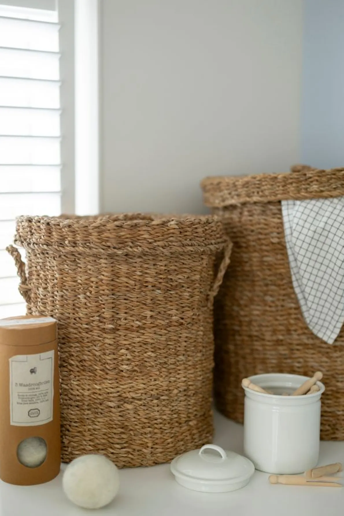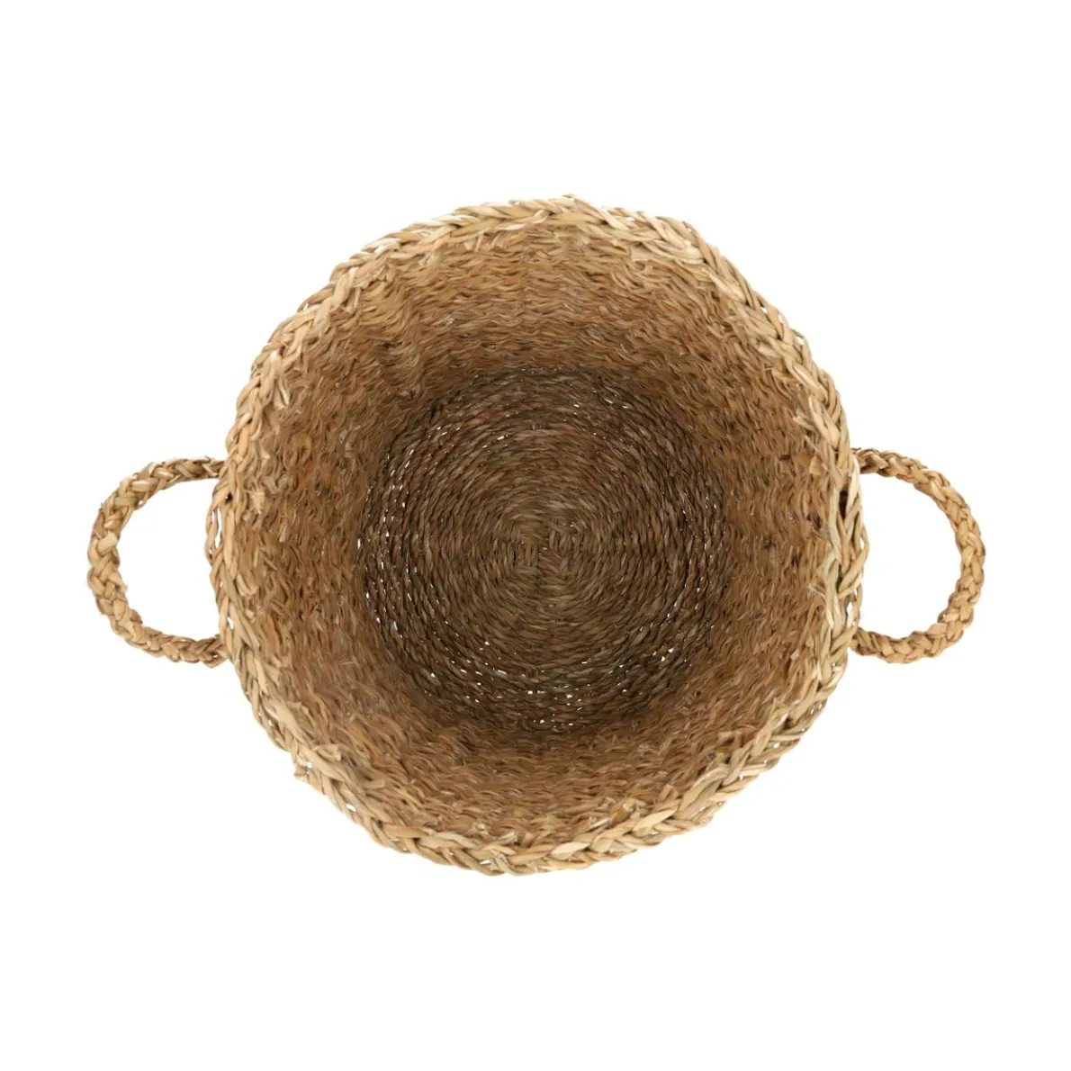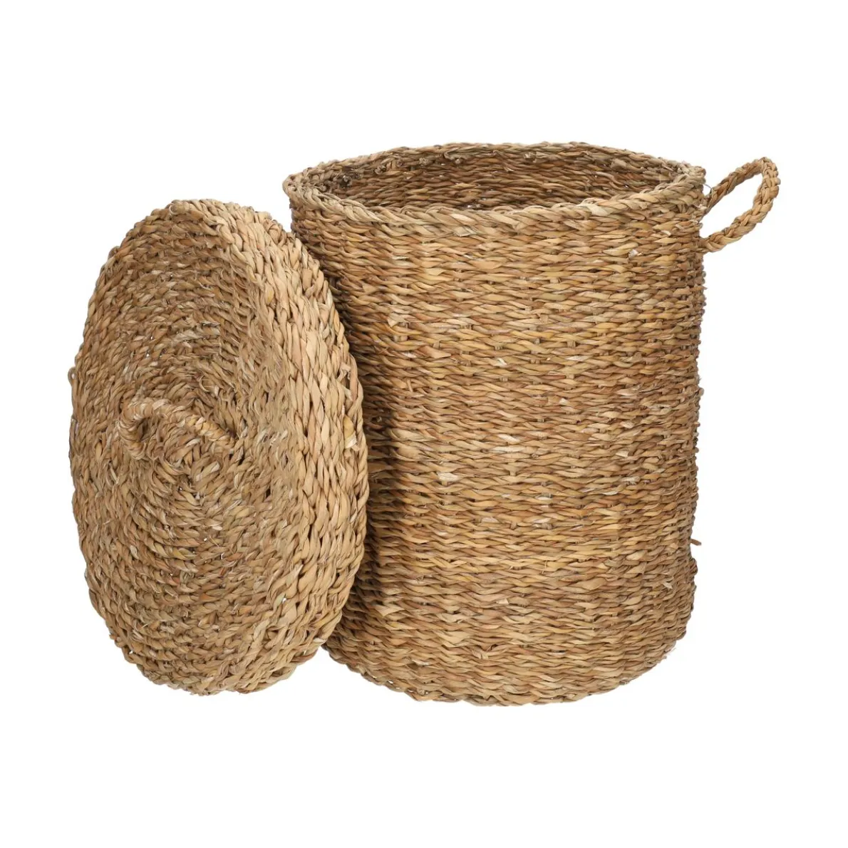 Stijlvolle, hand gevlochten ronde wasmand van zeegras met deksel. Het deksel heeft een handgreep en de rand van het deksel past over de mand. Geschikt voor wasgoed, maar bijvoorbeeld ook om speelgoed en andere spullen netjes in op te bergen. Met één of meer manden creëer je rust, sfeer en warmte in je huis.