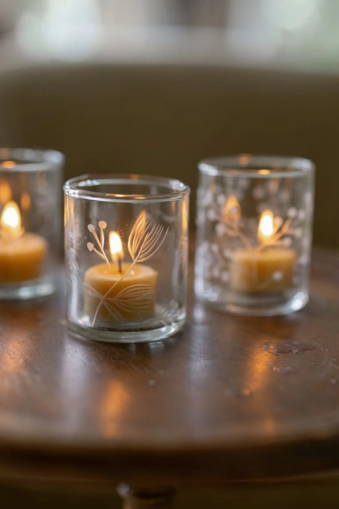 Transparant glazen houder voor een waxinelichtje. De theelichthouder is rondom gegraveerd met fijne bessentakjes, dit geeft een mooi effect als het kaarslicht erdoorheen schijnt. Zet de lichtjes alleen of in een groepje op tafel.