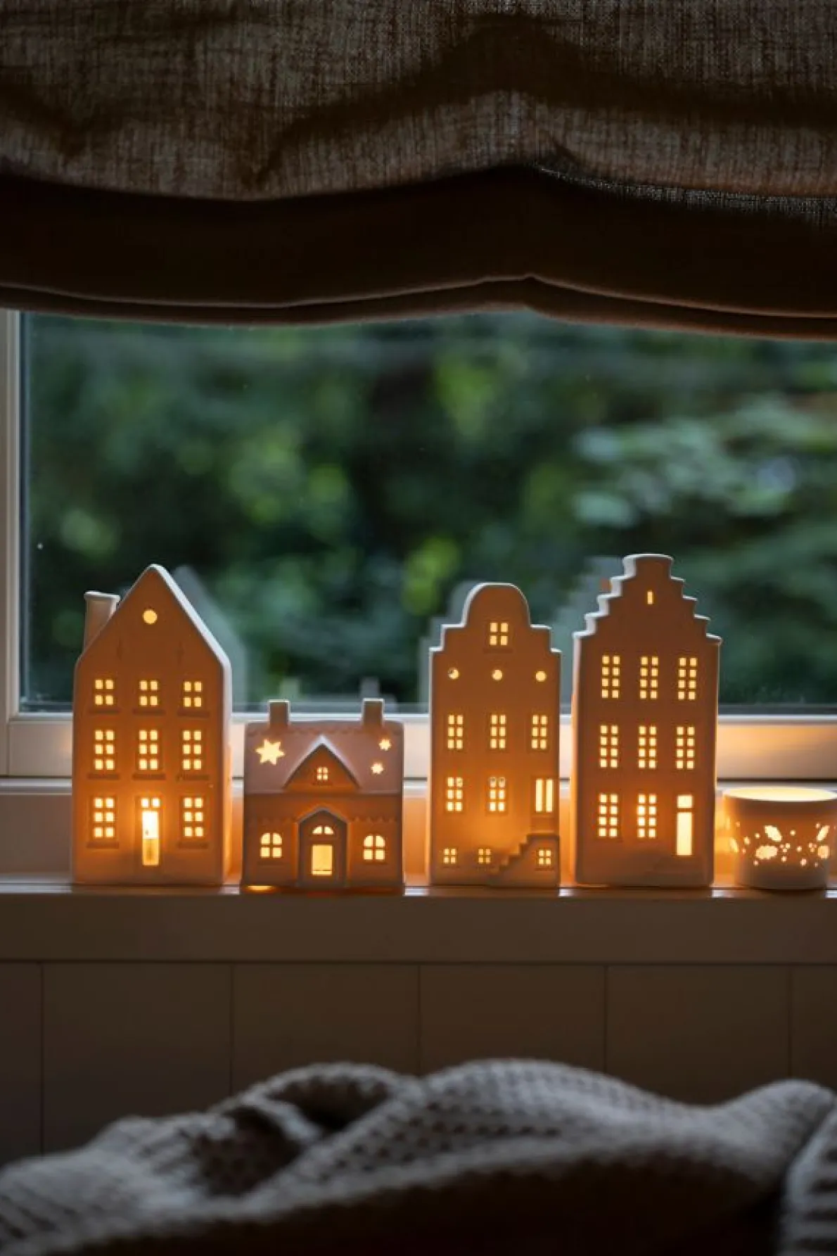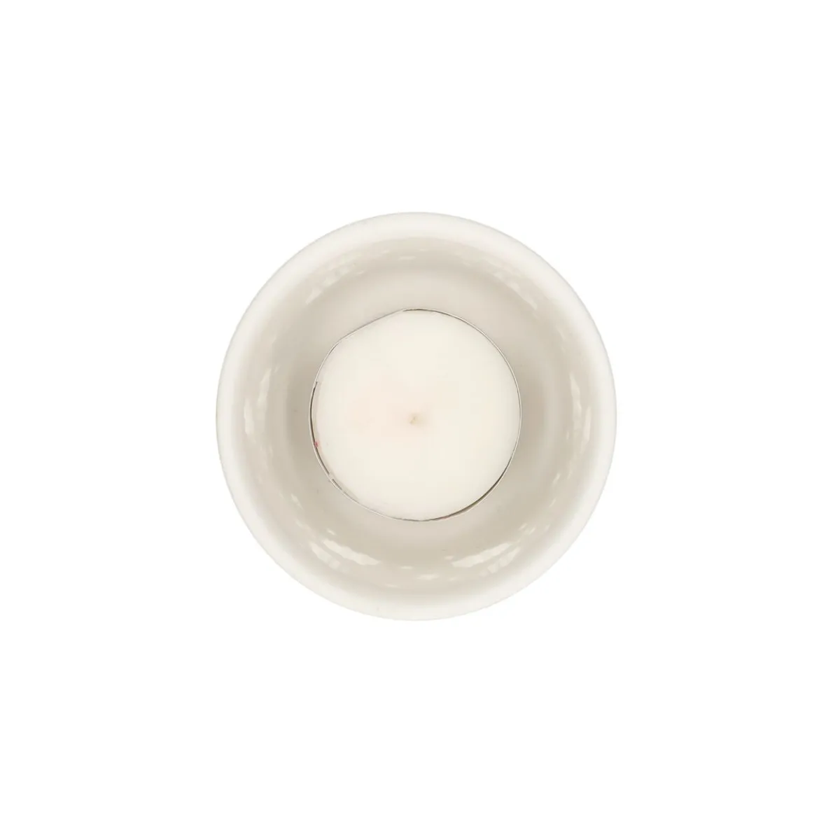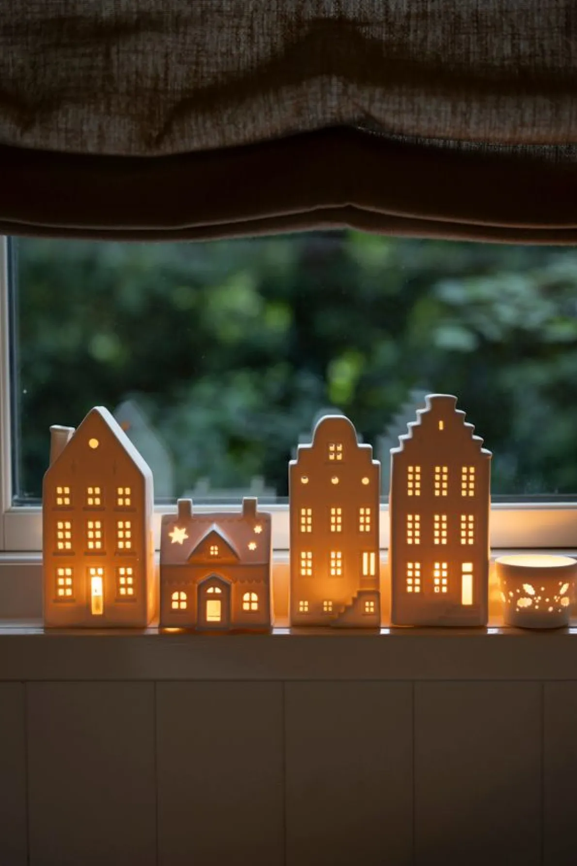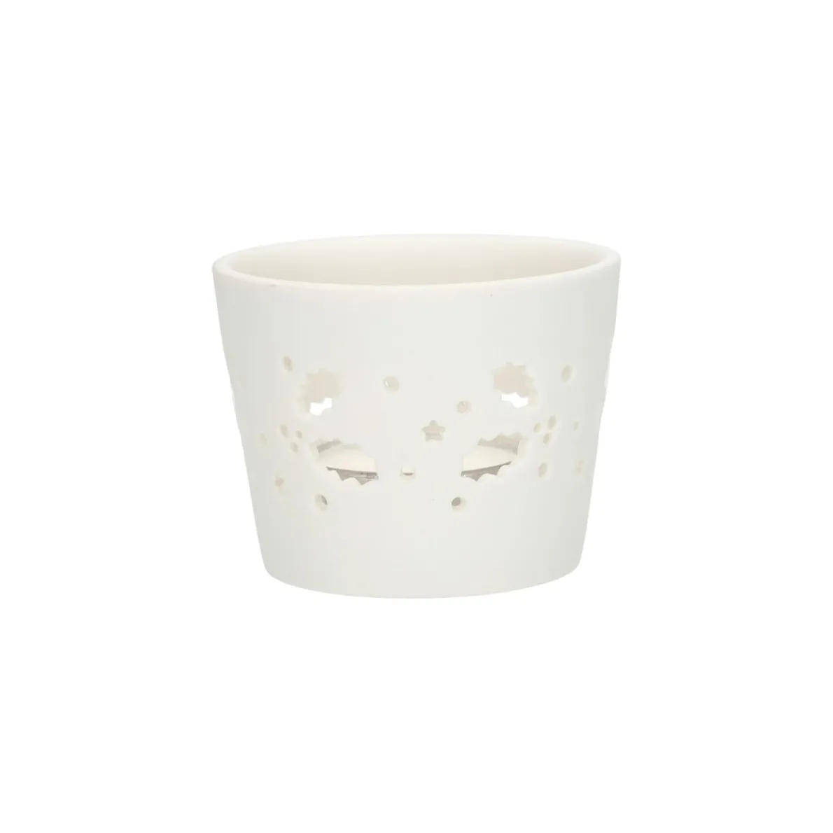 Ronde, witte porseleinen houder voor een waxinelichtje. De theelichthouder heeft rondom uitgespaarde hulstblaadjes, sterren en stipjes. Als het kaarslicht door deze gaatjes schijnt, geeft dit een mooi effect. Zet de lichtjes alleen of in een groepje op tafel.