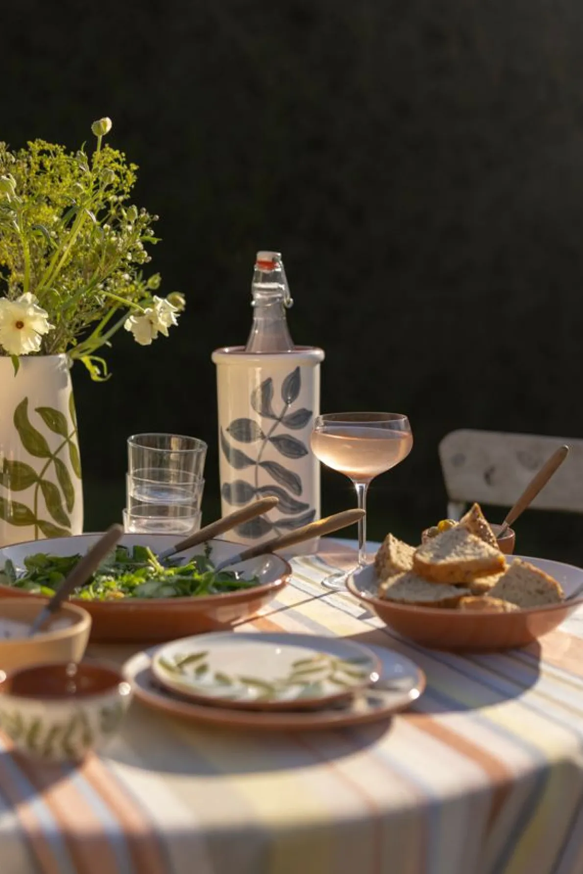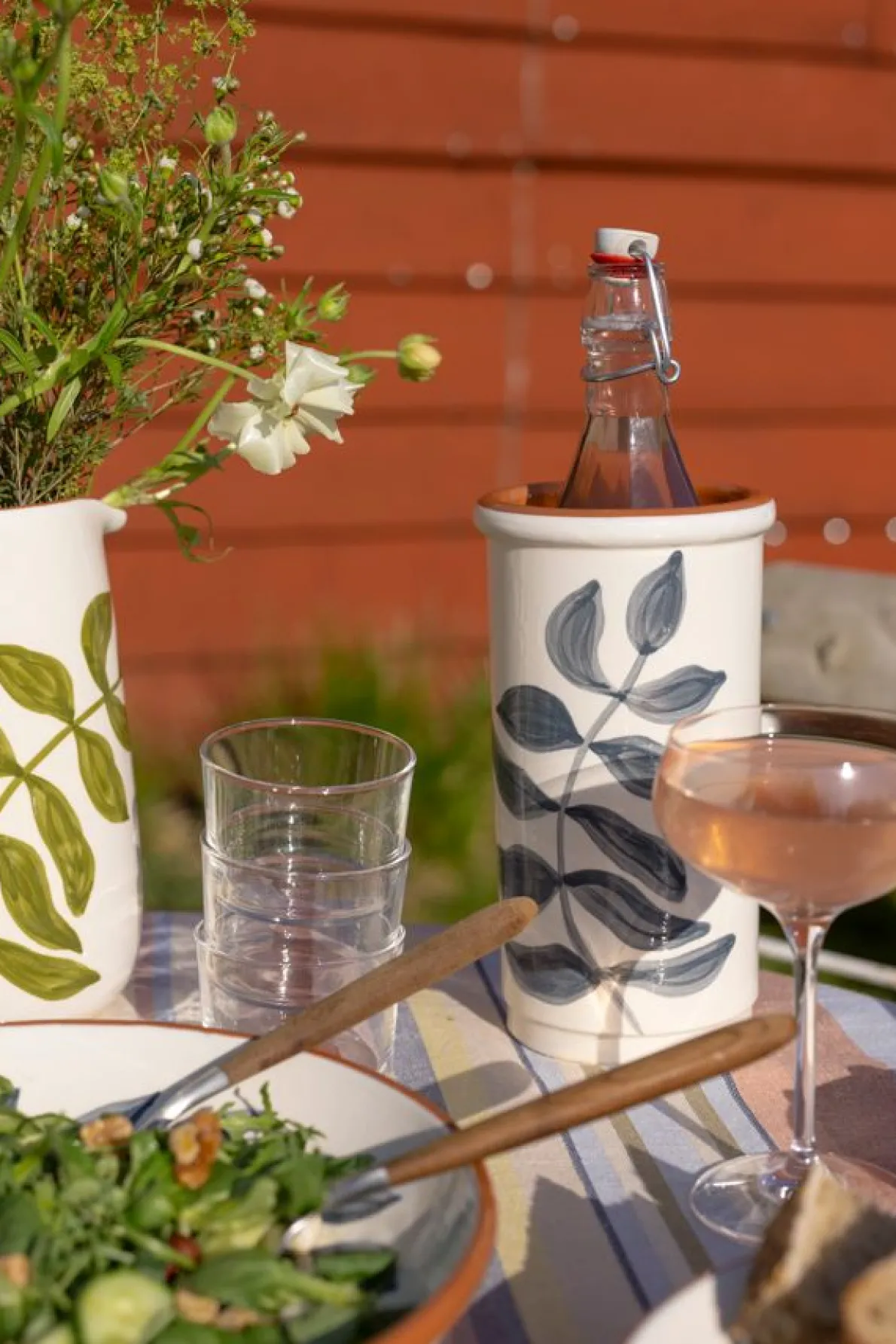 Traditionele wijnkoeler uit geglazuurd terracotta, ideaal om je favoriete fles een hele avond lekker fris te houden.Gebruik: plaats een vooraf gekoelde fles wijn in de koeler. Wil je je fles extra lang koel houden? Leg de koeler dan een uurtje op voorhand in koud water. Zet daarna de gekoelde fles erin: door de verdamping van het water blijft de inhoud fris.De wijnkoeler maakt deel uit van een serviesreeks. Een zomers servies uit geglazuurd terracotta, gemaakt en met de hand beschilderd in Portugal. Met dit servies breng je een warme, zuiderse sfeer op tafel. De wijnkoeler heeft een crèmekleurige geglazuurde buitenkant en een terracottakleurige binnenkant.Heel mooi in combinatie met de andere stukken uit dit servies, en leuk om te gebruiken samen met bijvoorbeeld onze houten kommetjes en serveerplanken. Het motief is een eigen ontwerp van Dille & Kamille.