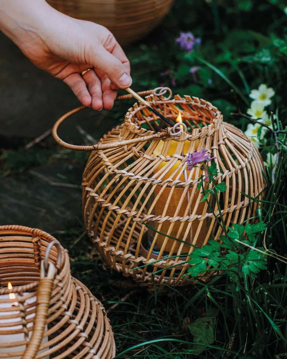 Sfeervol, handgemaakt windlicht van dunne, spiraalvormig gedraaide stroken rotan. Het windlicht heeft de vorm van een bolle vaas en een boogvormige handgreep. Binnenin staat een glazen houder voor een groot theelicht of stompkaars. Door de openingen tussen het rotan schijnt het kaarslicht prachtig naar buiten.